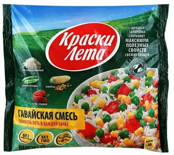 Гавайская овощная смесь замороженная Краски лета 400 гр замороженный продукт, в состав которого входят томаты, рис, зелёный горошек, кукуруза, сладкий перец. Смесь сохраняет свежесть овощей благодаря шоковой заморозке. Овощи собирают на пике спелости, за 4 часа доставляют на завод, чистят, режут и замораживают.
