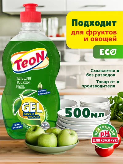 Гель для мытья посуды Teon Лайм и лимон 500 мл универсальный гель для мытья посуды с натуральным цитрусовым ароматом и эффективной моющей формулой. Средство быстро растворяет жир, остатки пищи и убирает неприятные запахи даже в холодной воде. Не оставляет разводов, легко смывается и придаёт поверхности посуды приятный блеск.Уникальное преимущество – мягкий состав с нейтральным уровнем pH, который бережно относится к коже рук и не вызывает раздражения при частом использовании.