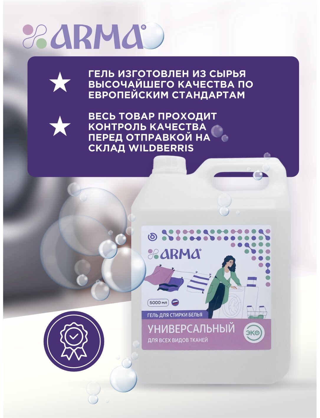 Универсальный гель для стирки АРМА объемом 5 литров - это высококачественное средство для бережного ухода за вашим бельем. Он идеально подходит для различных типов тканей, включая деликатные, цветные, черные и даже спортивные вещи.