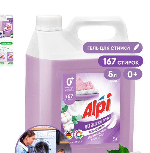 Концентрированное жидкое средство для стирки Alpi Delicate gel. Предназначено для стирки и замачивания изделий из хлопчатобумажных, льняных, синтетических тканей и тканей из смешанных волокон в стиральных машинах любого типа и ручной стирки в воде любой жесткости. Отстирывает даже самые сильные загрязнения. Стирку вещей осуществлять при температуре 20-60°С. Для выбора способа стирки следуйте рекомендациям на ярлыках изделий. Перед использованием средство рекомендуется взболтать.
