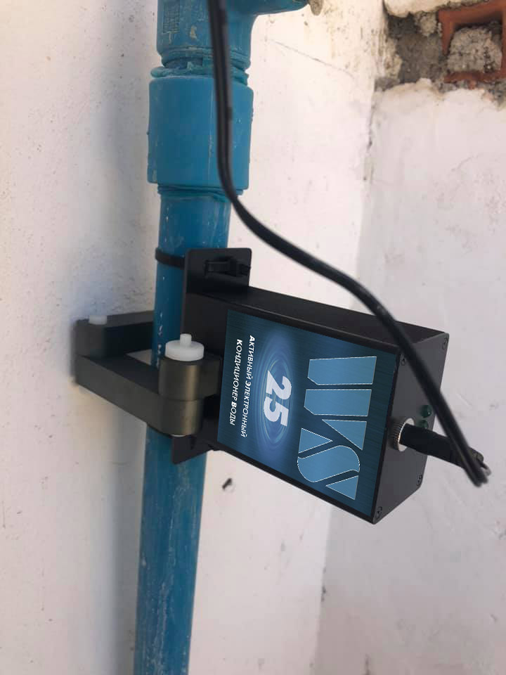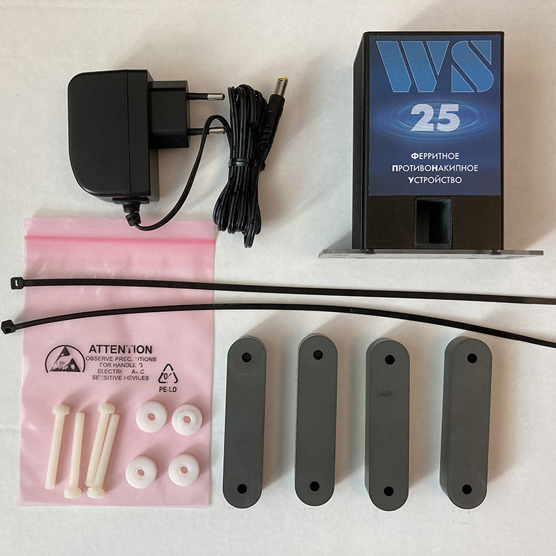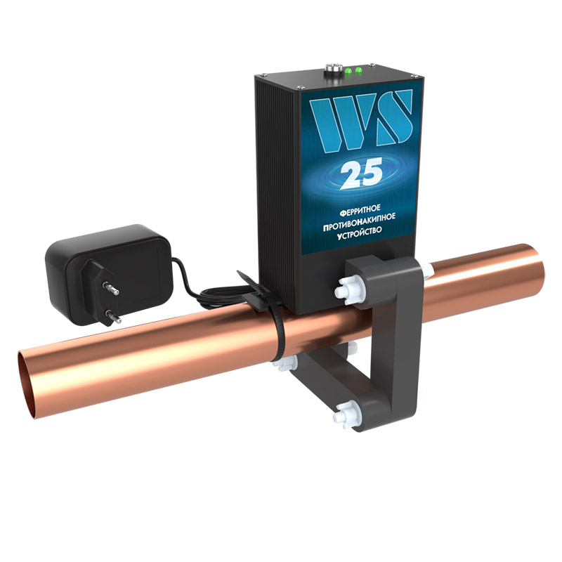 Противонакипное устройство WS-25 (прибор от накипи), это электронное устройство, которое препятствует осаждению накипи в трубах, в котлах и в бытовой технике. Его принцип действия основан на создании внутри водопроводной системы электромагнитного поля с эффектом «стоячей волны». Поле отталкивает ионы кальция – основной элемент накипи, от поверхностей труб, от нагревательных элементов (ТЭНов), и защищает их тем самым от осаждения накипи. Устройство размягчает и частично удаляет стуществующие накипные отложения.