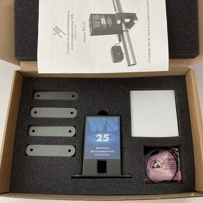 Комплектность: устройство, блок питания, 4 ферритовые пластины, крепёж ферритовых пластин? 4 шт., 2 хомута для крепления устройства к трубе, документация.