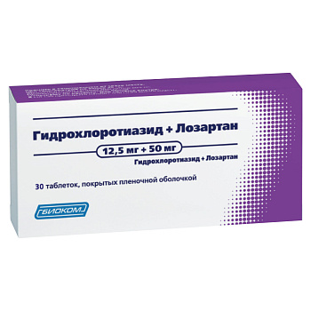 Гидрохлоротиазид+Лозартан - это комбинированный антигипертензивный препарат (блокатор рецепторов ангиотензина II + диуретик), предназначенный для лечения артериальной гипертензии. Он снижает давление эффективнее компонентов по отдельности, сохраняя действие 24 часа. Поставляется в виде таблеток, покрытых пленочной оболочкой, (30 таблеток) 12,5 мг+50 мг.