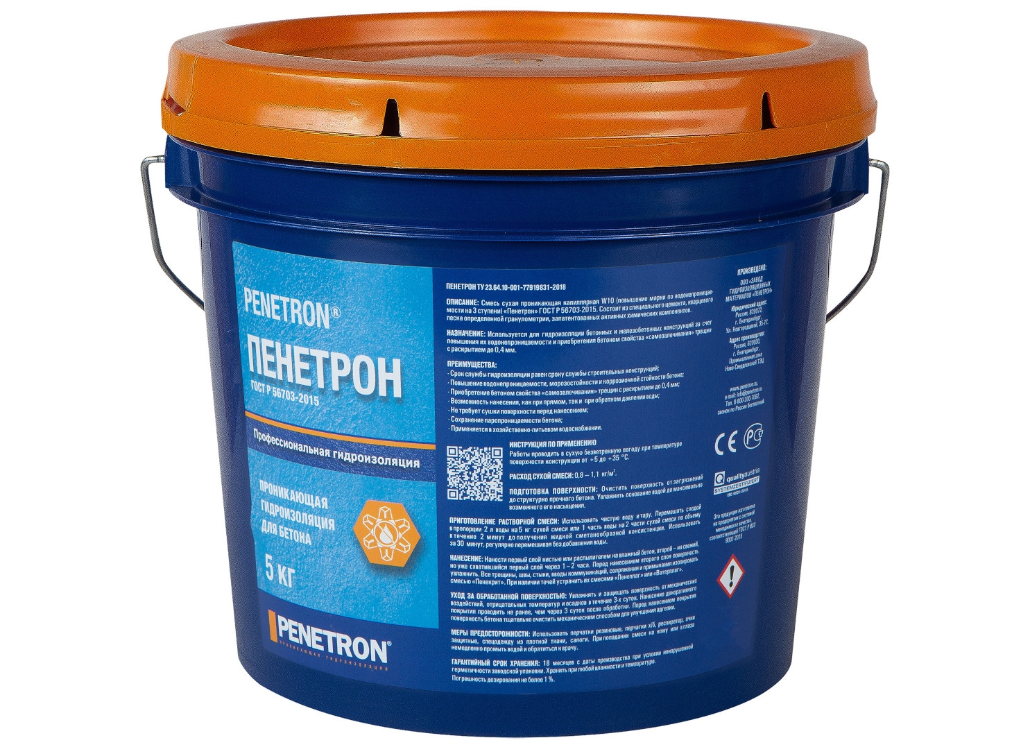 Гидроизоляционный проникающий состав Пенетрон 5 кг на цементном вяжущем ΔW3 (повышение марки по водонепроницаемости на 3 ступени) ГОСТ 34669-2020. Состоит из портландцемента, кварцевого песка определенной гранулометрии, активных химических компонентов.Используется для гидроизоляции бетонных и железобетонных конструкций за счет повышения их водонепроницаемости и приобретения бетоном свойства «самозалечивания» трещин c раскрытием до 0,4 мм.