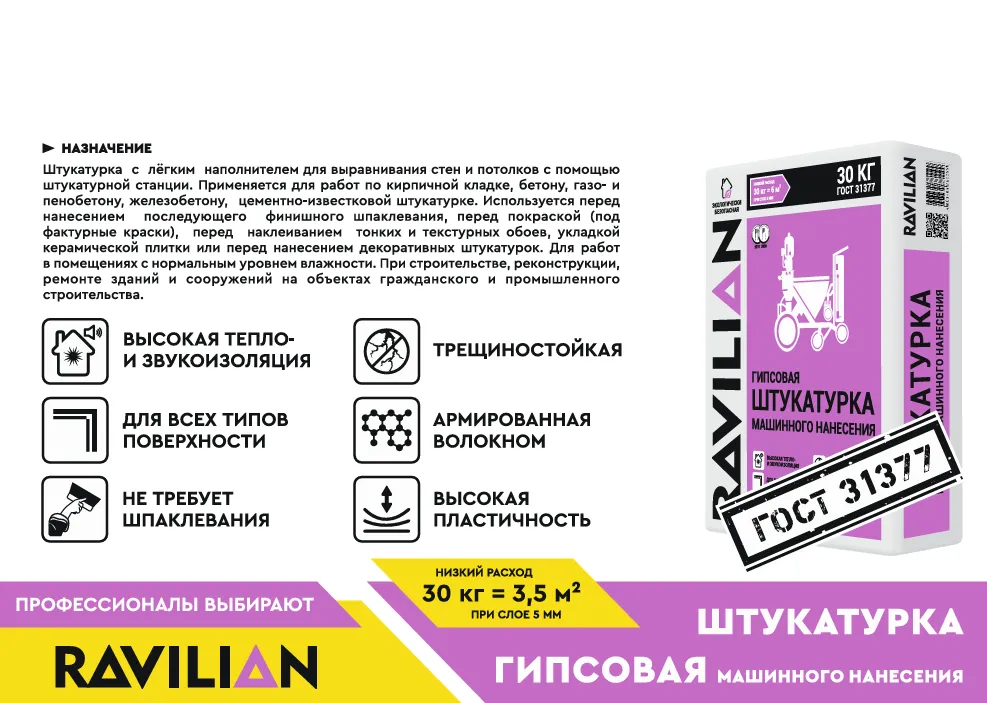 Гипсовая штукатурка машинного нанесения 30 кг сухая смесь на гипсовой основе с добавлением специальных химических добавок (пластификаторов, загустителей, замедлителей схватывания и др.). Предназначена для машинного нанесения с помощью штукатурной станции. Может использоваться перед финишным шпаклеванием, покраской (под фактурные краски), наклеиванием тонких и текстурных обоев, укладкой керамической плитки или нанесением декоративных штукатурок. Применяется при строительстве, реконструкции, ремонте зданий и сооружений на объектах гражданского и промышленного строительства.