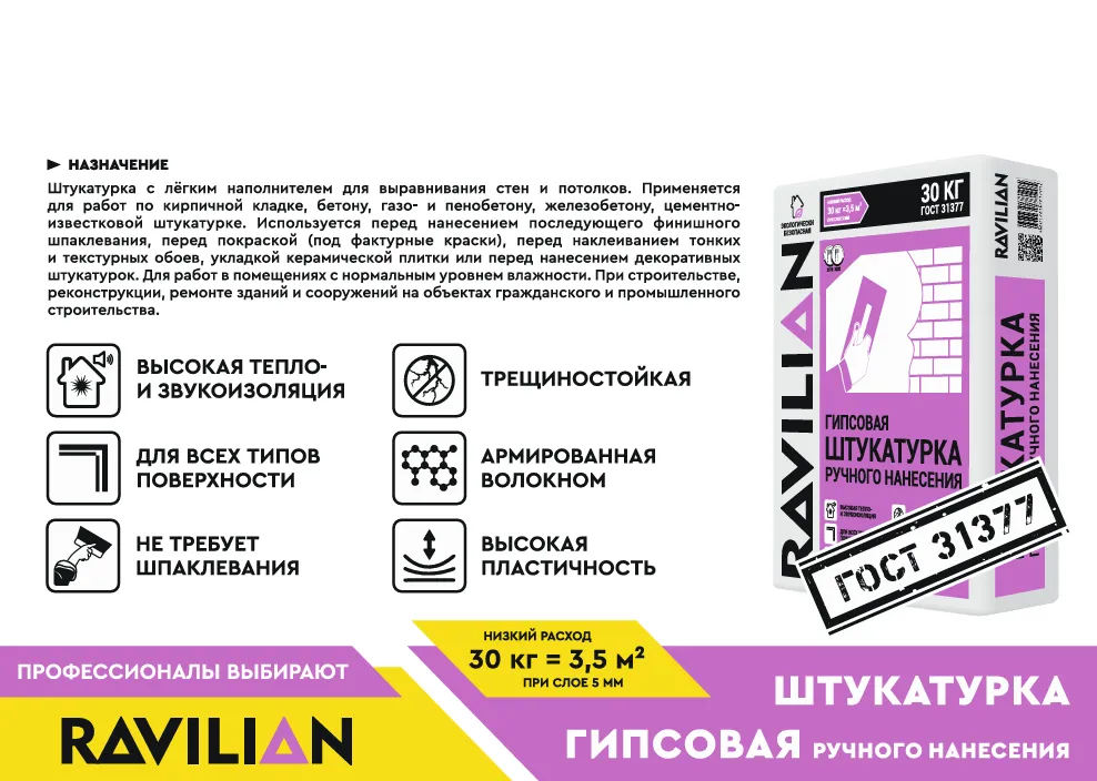 Гипсовая штукатурка ручного нанесения 30 кг сухая смесь на гипсовой основе с добавлением специальных химических добавок (пластификаторов, загустителей, замедлителей схватывания и др.). Предназначена для ручного нанесения и используется для выравнивания стен и потолков внутри помещений.