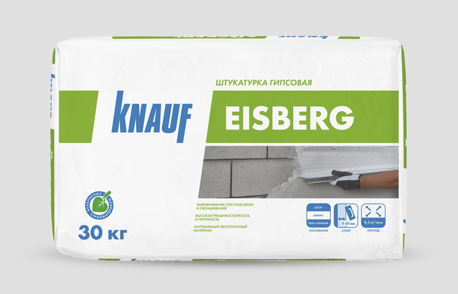 Гипсовая штукатурная смесь КНАУФ-Айсберг для высококачественного выравнивания стен слоем от 8 до 50 мм в помещениях с нормальной влажностью, а также в кухнях и ванных комнатах перед окраской, оклейкой обоями, укладкой керамической плитки и нанесением других финишных отделочных материалов. Для ручного нанесения.Сухая гипсовая смесь КНАУФ-Айсберг предназначена для высококачественного оштукатуривания вручную стен внутри помещений с нормальной влажностью, а также в кухнях и ванных комнатах (с покрытием, обеспечивающим защиту от увлажнения). Наносится на обычные твердые основания (кладку из кирпича — керамического, силикатного, пустотелого и т. д., бетон, гипсовые и бетонные блоки, старые цементные и гипсовые штукатурки, газобетон и пенобетон), а также на сложные основания (ЦСП, ПГП, ГКЛ (ГСП), щепоцементные плиты и блоки). При соблюдении технологии работ позволяет достичь категории качества поверхности Q3 (К3).
