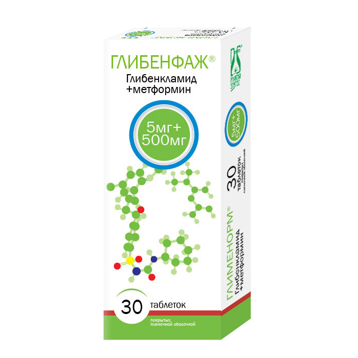 Глибенфаж - то комбинированный пероральный препарат для лечения сахарного диабета 2 типа, объединяющий глибенкламид (стимулирует выработку инсулина) и метформин (повышает чувствительность к нему). Обладает панкреатическим и внепанкреатическим эффектами. Используется при неэффективности диеты или монотерапии. Поставляется в виде таблеток (обычно 2,5/500 мг или 5/500 мг) в упаковках по 30 штук.
