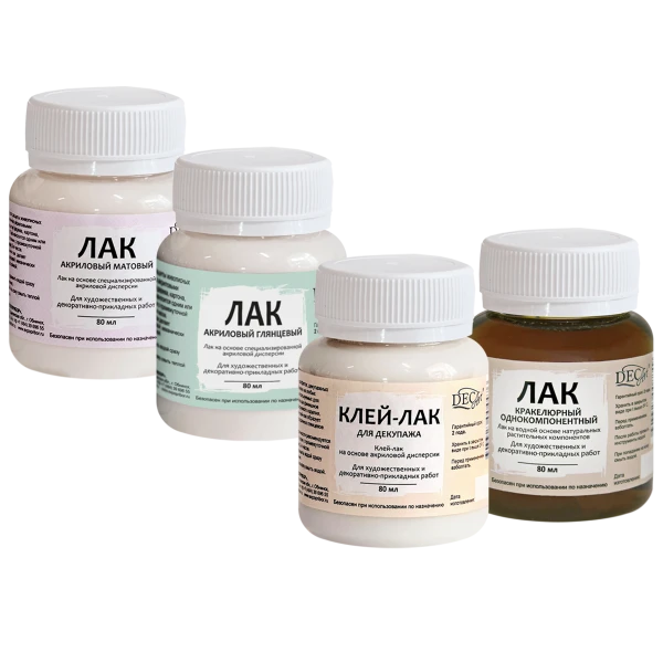 Глянцевый лак DecArt® и Матовый лак DecArt® изготовлены на основе специализированных акриловых дисперсий и применяются для защиты живописных работ, выполненных акриловыми красками, для придания блеска или матовости дереву, картону и другим материалам.