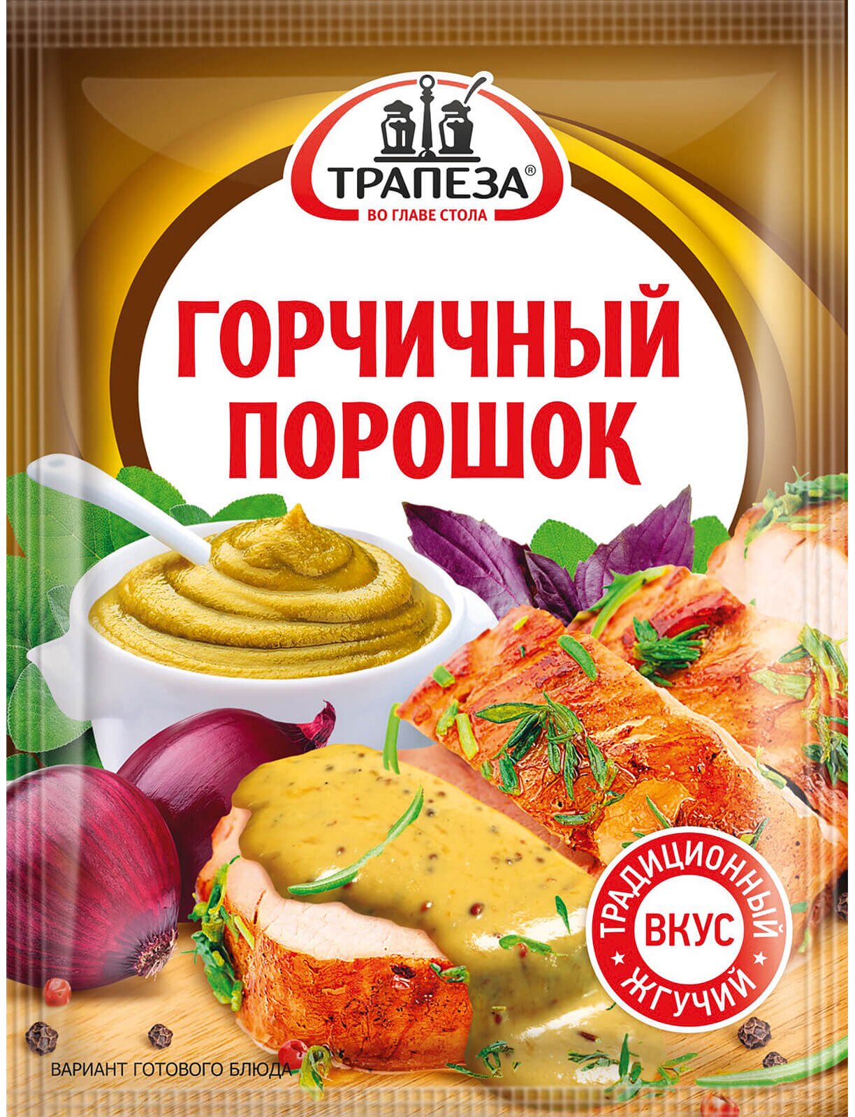 - в кулинарии: Перемолотый горчичный жмых (горчичный порошок) употребляется при приготовлении столовой горчичной приправы, которую подают к говяжьему и свиному мясу, различной дичи, добавляют в холодные и горячие подливки. В качестве приправы добавляют к мясным супам, фаршам и другим горячим и холодным мясным блюдам. Служит хорошим эмульгатором (защитным покрытием) для мяса при тепловой обработке.