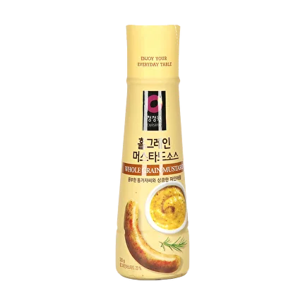 "Whole Grain Mustard sauce" - горчичный соус производителя «Daesang Corp. Co., Ltd» . Соус приготовлен из дижонской горчицы и французского горчичного зерна высшего качества. Используется как соус к жареному мясу, а также как заправка к салатам из курицы и овощей.