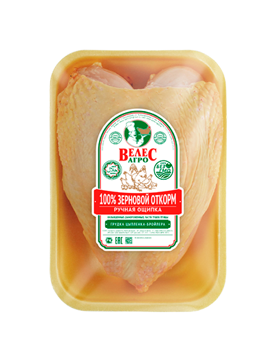 Грудные мышцы овальной формы с грудной костью и кожей. Нежное бело-розовое мясо, низкая калорийнность.