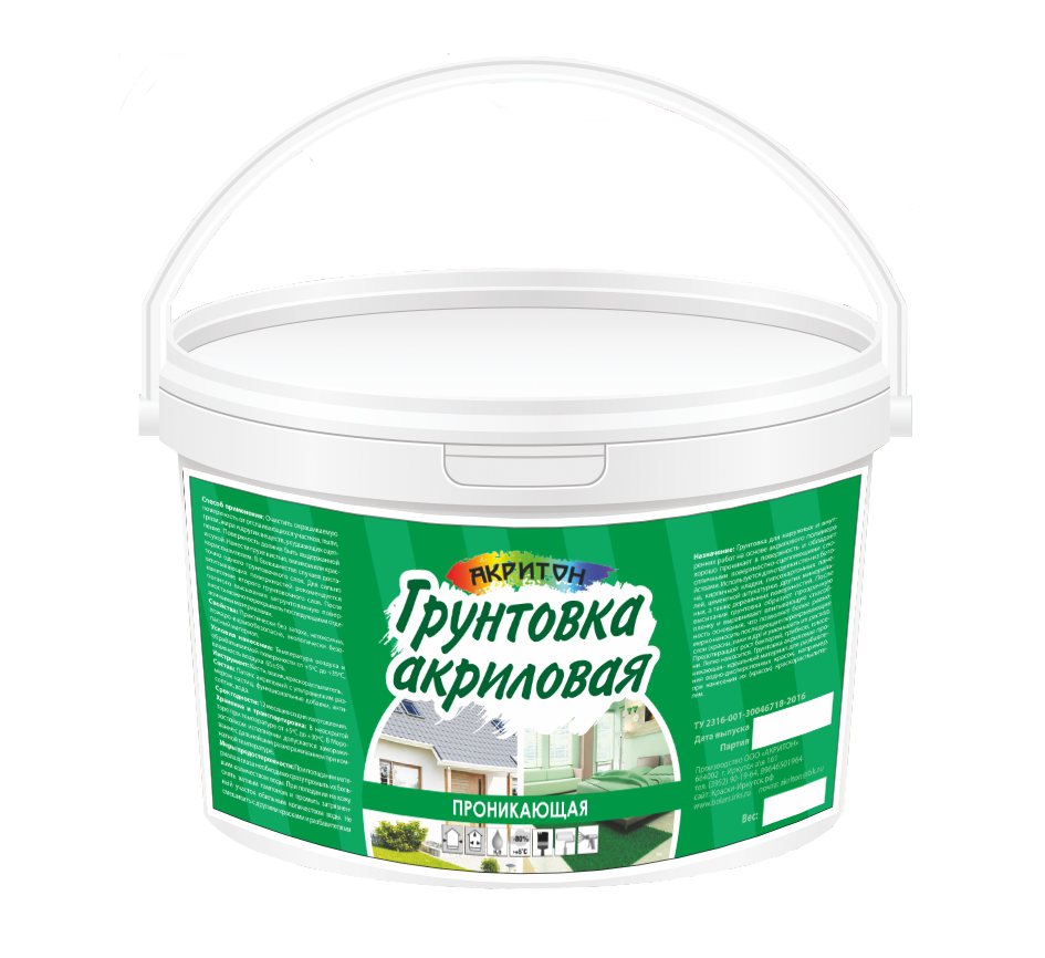 Грунтовка акриловая проникающая "АКРИТОН" предназначена для наружных и внутренних работ, обладая отличными поверхностно-сцепляющими свойствами, и применяется для обработки стен из бетона, кирпичной кладки, гипсокартонных панелей, цементной штукатурки, других минеральных, а также деревянных поверхностей. После высыхания грунтовка образует прозрачную пленку, выравнивает впитывающую способность основания, что обеспечивает более равномерное нанесение последующих отделочных слоев (красок, лаков) и снижает их расход, а также предотвращает рост бактерий, грибков и плесени. Грунтовка легко наносится и может использоваться как идеальный материал для разбавления водно-дисперсионных красок при нанесении краскораспылителем.