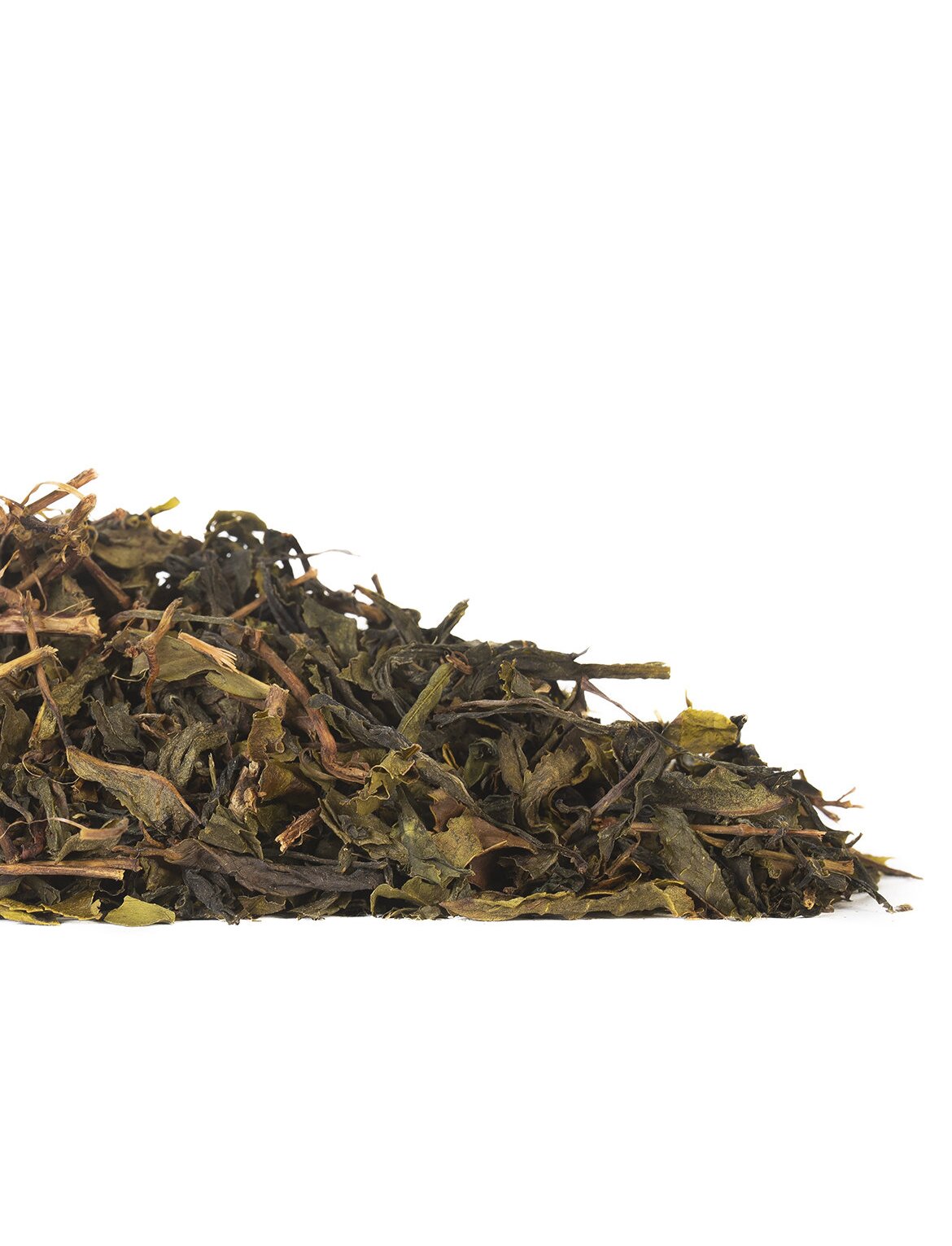 В сухом виде: большие, зеленые, слабо скрученные вдоль оси чайные листья с длинными черенками. Аромат сдержанный, травянистый. Настой прозрачный, виноградно-зеленого оттенка.
