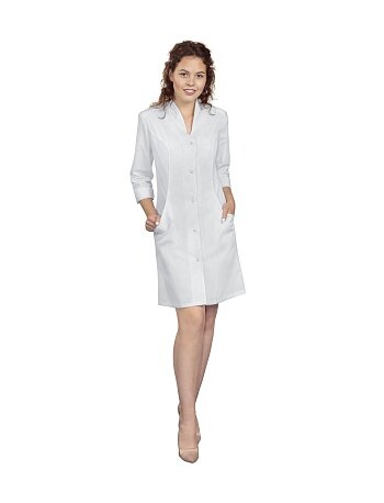 Халат медицинский Мелиса женский. Воротник-стойка, V-образный фигурный вырез, центральная застежка на кнопках;карманы боковые в рельефных швах;рукава длинные или 3/4; регулировка объема – хлястики на кнопках в боковых швах.