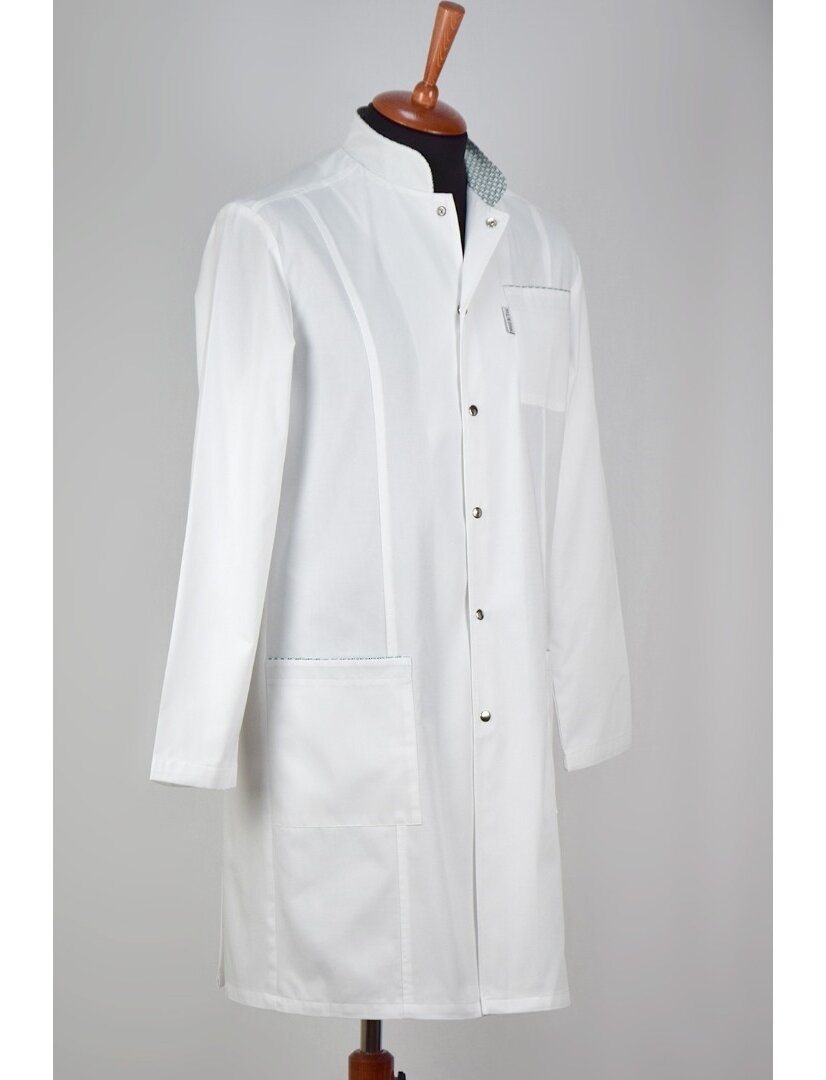 Халат медицинский мужской М2-372 является моделью коллекции Trend. Воротник - стойка и карманы с цветной принтованной отделкой, сзади двойная шлица, застежка на кнопке, отстрочка.