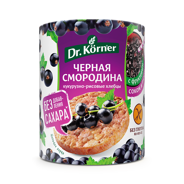 Сладкие цельнозерновые воздушные хлебцы Dr.Körner без добавления сахара и без глютена – это возможность получить удовольствие от сладкого без потребления сахара и большого количества калорий. Сладость достигается за счет добавления черносмородинового пюре и сока из яблок и черной смородины. Кукурузно-рисовая зерновая основа придает хлебцам нежную и мягкую текстуру.