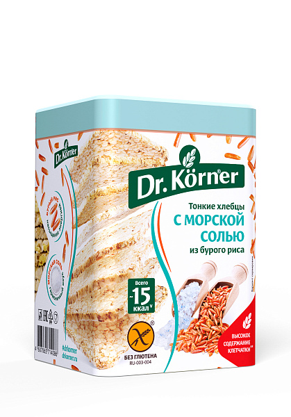 Тонкие хлебцы Dr. Korner из бурого риса с морской солью - невероятное сочетание приятного вкуса и огромной пользы. Бурый рис обогащен магнием, марганцем, витаминами из группы В, железом, а также прочими полезными питательными веществами, необходимыми для поддержания крепкого здоровья и отличного самочувствия. Морская соль также является источником множества необходимых организму микроэлементов: кальция, железа, селена, йода и других. Хрустящие хлебцы из бурого риса несомненно понравятся всем приверженцам здорового питания и ценителям натуральной пищи. Хлебцы относятся к категории постных продуктов, не содержат глютен и подходят в качестве диетического питания.