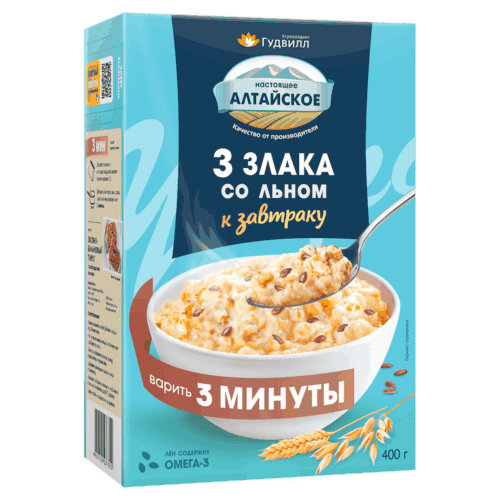 Агрохолдинг Гудвилл – крупный производитель полного цикла с Алтая, где чистая экология и мягкий климат – основа для выращивания злаков. Это позволят передать максимум природной пользы в идеально сбалансированном сочетании овсяных, пшеничных и ячменных хлопьев с семенами льна. Семена льна это природный суперфуд, который содержит Омега 3