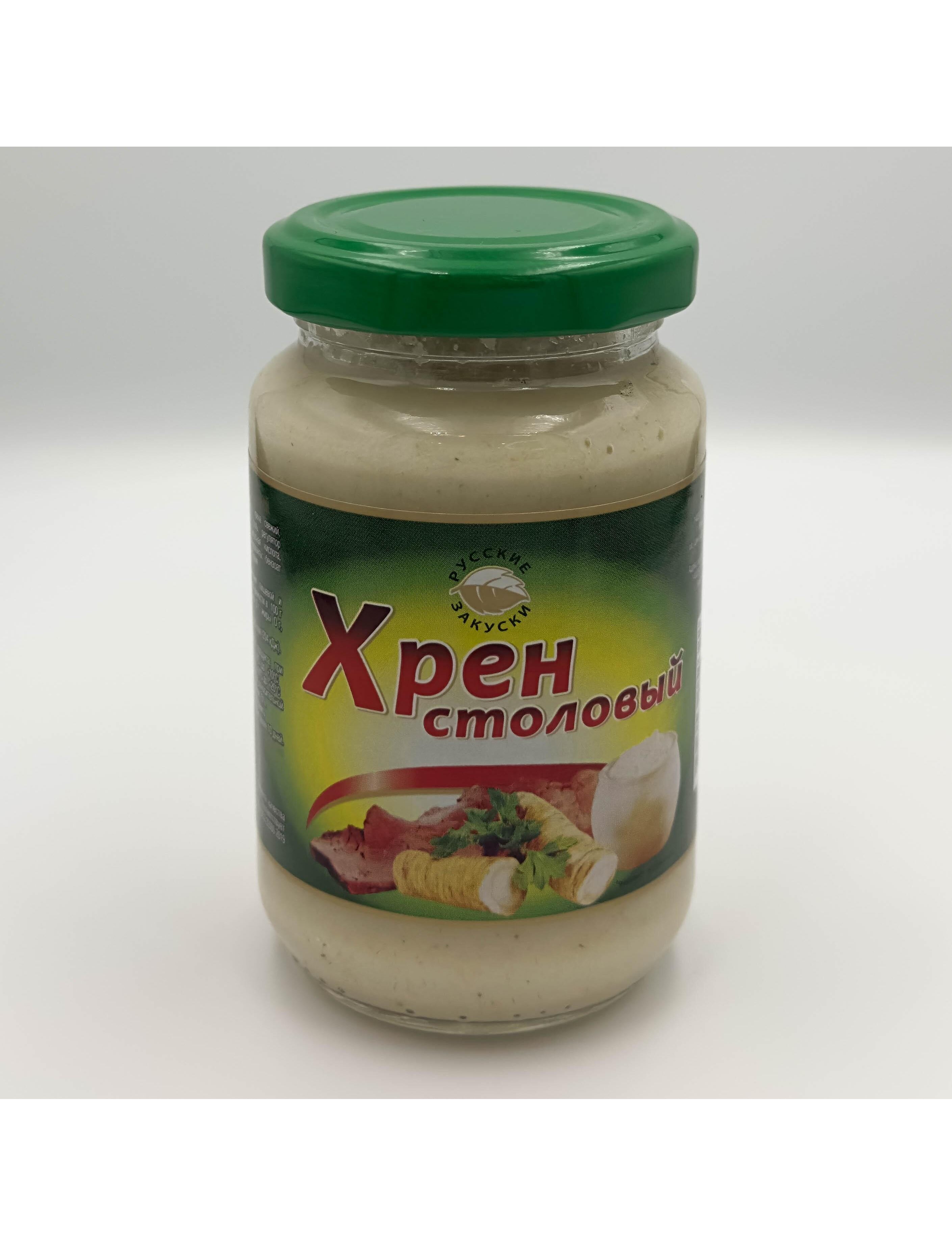 Хрен Столовый 200 мл является традиционной приправой к мясу и рыбе, хорош с холодцом.В состав входят: корень хрена свежий, вода питьевая, соль, сахар, уксус (вода, регулятор кислотности — уксусная кислота), масло растительное, консервант — бензоат натрия.