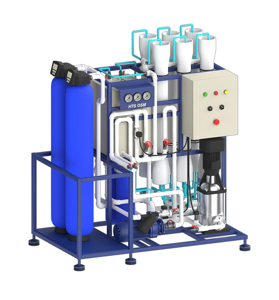 Система промышленного обратного осмоса HTS OSM предназначена для очистки и деминерализации воды в промышленных масштабах. Она используется для удаления из воды растворённых солей, органических веществ, бактерий и других загрязнителей. Производительность - от 300 л/час. Степень очистки - до 99%. Расходные материалы - фильтрующие катриджи. Габариты - 1,5*1,0*1,7м. Бак накопитель - от 1м3. Дополнительный модуль - CIP мойка.