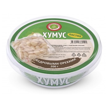 Состав: нут (турецкий горох), вода, кунжутная паста тахини, растительное масло, соль, лимонная кислота (регулятор кислотности), сорбат калия (консервант), ксантановая камедь, чеснок, орехи кедровые, специи.