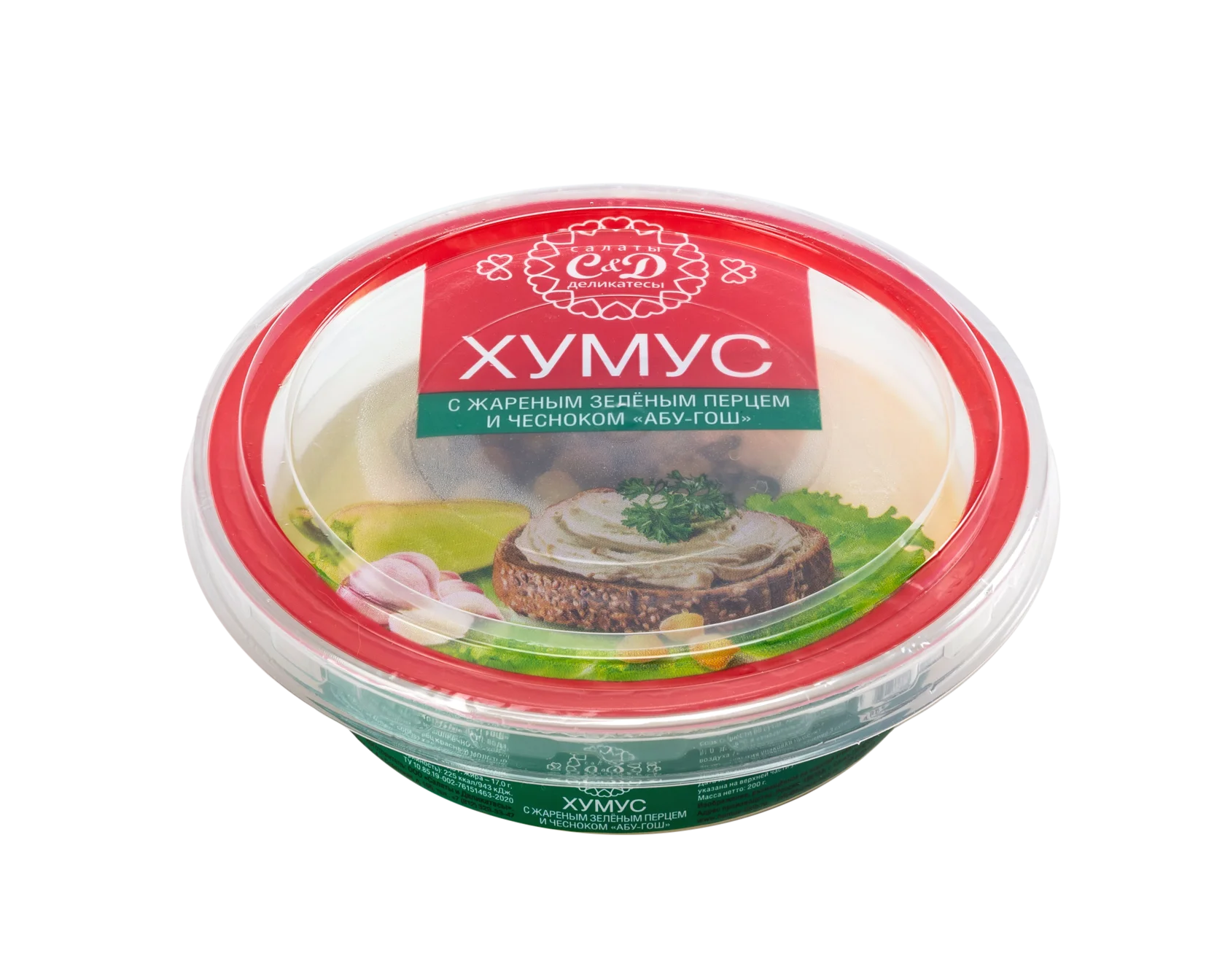 Состав: нут, масло подсолнечное, кунжутная паста (кунжут), соль, чеснок молотый, перец красный молотый, Абу-Гош (нут, перец зелёный жареный, перец острый, чеснок, кинза, зира), антиокислитель: лимонная кислота, консерванты: сорбат калия, бензоат натрия. Может содержать незначительное количество арахиса, кедрового ореха.
