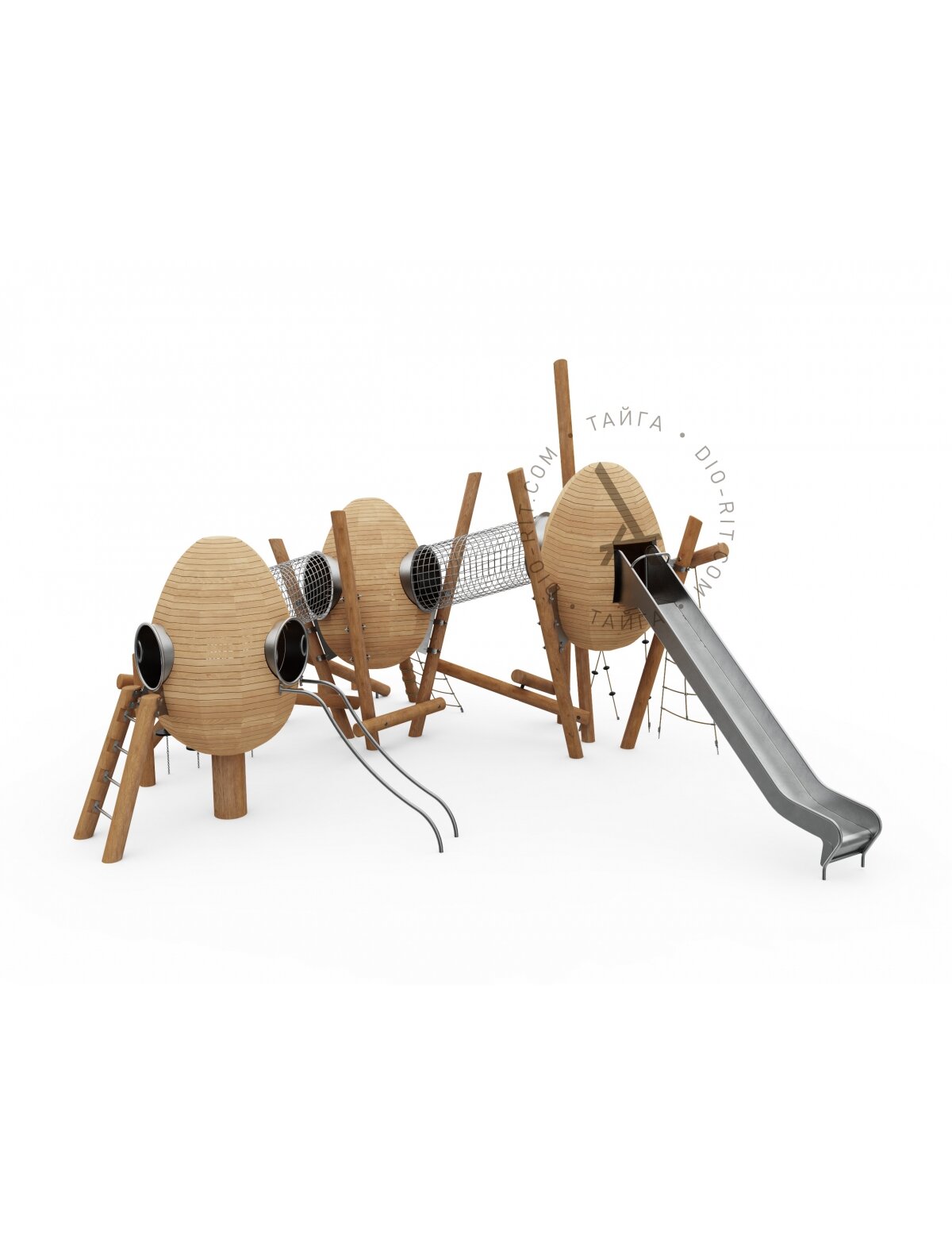 Игровой комплекс Гнёзда - это современное детское оборудование премиум-класса, вдохновлённое природой, которое представляет собой конструкцию в виде переплетающихся "яиц", соединённых лазательными сетками, горками и лестницами, предназначенное для активного и разностороннего развития детей, обеспечивая безопасное пространство для игр и физической активности. Он развивает силу, координацию, гибкость и воображение, позволяя детям перемещаться по комплексу, не спускаясь на землю. Комплекс рассчитан на возраст - от 5 до 14 лет. Габариты - 7,7 * 9,1 *5 м. Высота падения - 2 м. Зона приземления - 10,7*12,6 м.