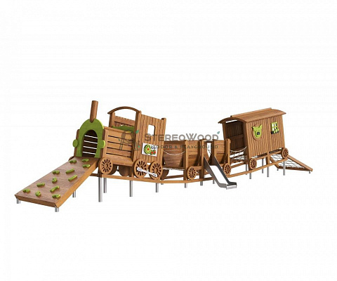 Игровой комплекс "Паровоз" многофункционален и включает разнообразные игровые элементы, такие как переходы, горки из нержавеющей стали, канатные конструкции и мостики. Комплекс разработан для активного отдыха на свежем воздухе детей в возрасте от 3 до 7 лет. Каркас и обшивка выполнены из дерева. Покрытие - деревозащитный декоративный глубокопроникающий состав на алкидной основе. Есть возможность выбора цвета или сочетания цветов под заказ. Стандартные цвета: орех, орегон, махагон. Игровой комплекс включает в себя армированный канат диаметром 16 мм. Размер - 11490*2050*2570 мм. Критическая высота падения - 1000 мм.
