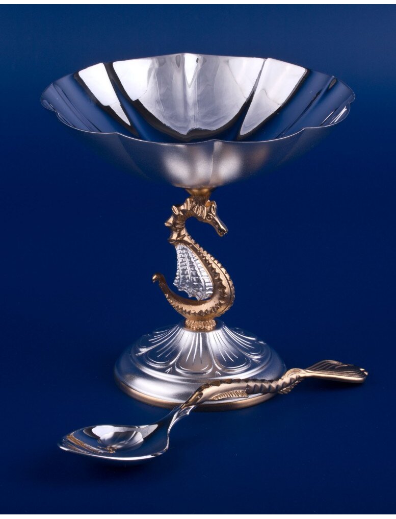 Икорница из серебра №3 с ложкой - это элитный предмет сервировки стола, предназначенный для изысканной подачи черной или красной икры. Она состоит из металлической основы (часто с позолотой), стеклянной вставки для льда и икры, а также серебряной ложечки, что помогает сохранить вкус и свежесть продукта. Изготавливается из серебра 925 пробы, украшается чеканкой или гравировкой. Размер - 107*110 мм. Средний вес - 208,0 гр.