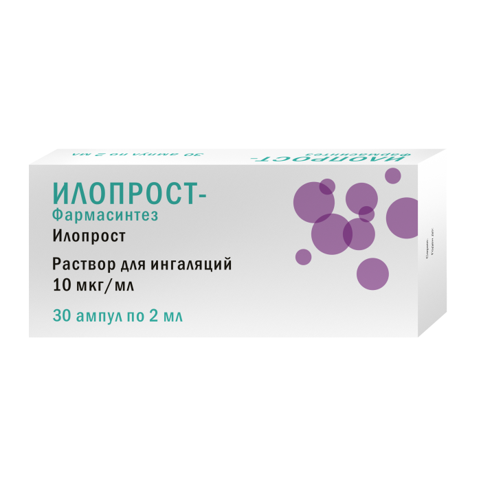 Илопрост-Фармасинтез - это синтетический аналог простациклина, применяемый для лечения среднетяжелой и тяжелой легочной гипертензии (повышенного давления в сосудах легких). Препарат расширяет артерии, улучшает кровоток, препятствует склеиванию тромбоцитов и уменьшает одышку. Поставляется в виде прозрачного раствора для ингаляций (10 мкг/мл).
