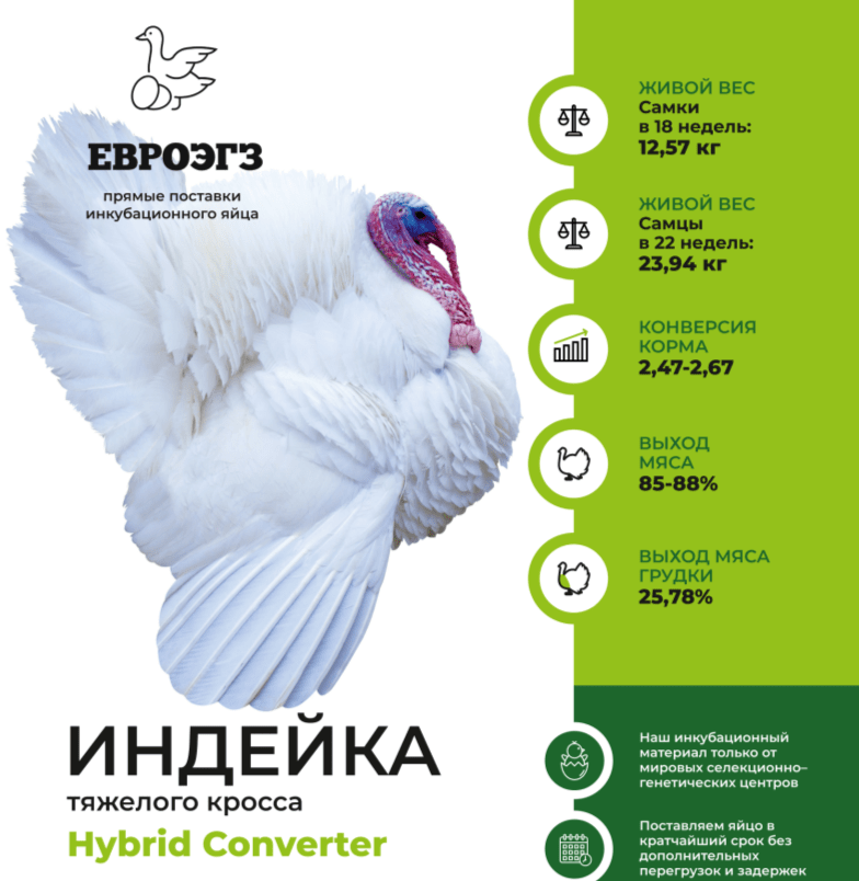 Hybrid Converter - это тяжелый кросс, что означает, что он был получен путем скрещивания двух разных пород индеек. Это позволяет получить более крупных и тяжелых индюшат с лучшими показателями продуктивности.