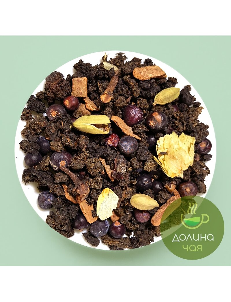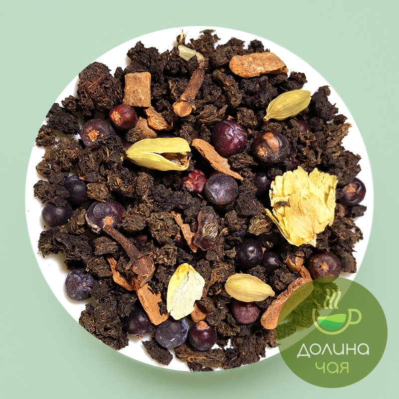 Гранулированный луговой иван-чай с кусочками корицы, гвоздики, имбиря, кардамона, шишками хмеля, медовыми гранулами, душистым перцем, кусочками солодки и можжевеловой ягодой.