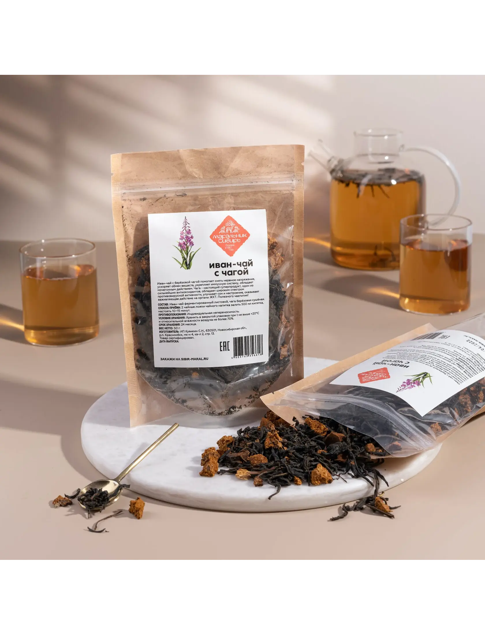 Состав: Иван-чай ферментированный листовой, чага берёзовая сушёная.
