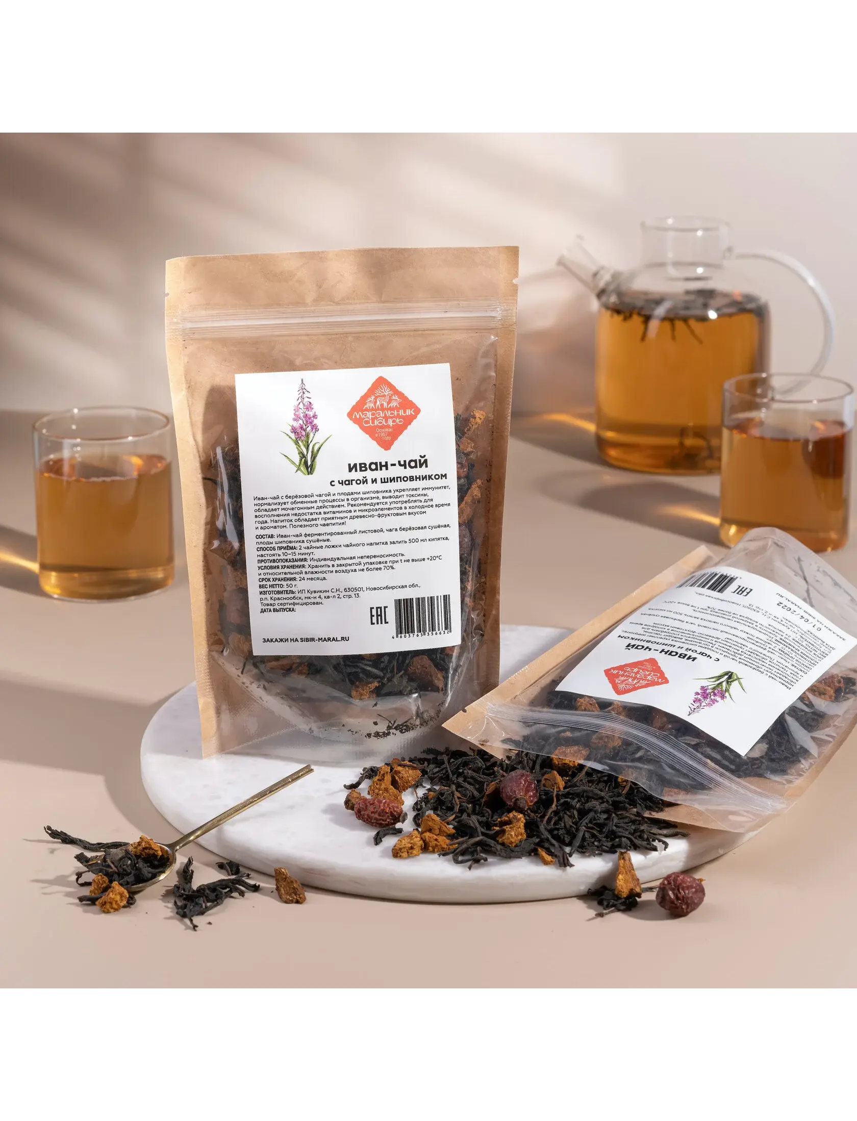 Состав: Иван-чай ферментированный листовой, чага берёзовая сушёная, плоды шиповника сушёные.