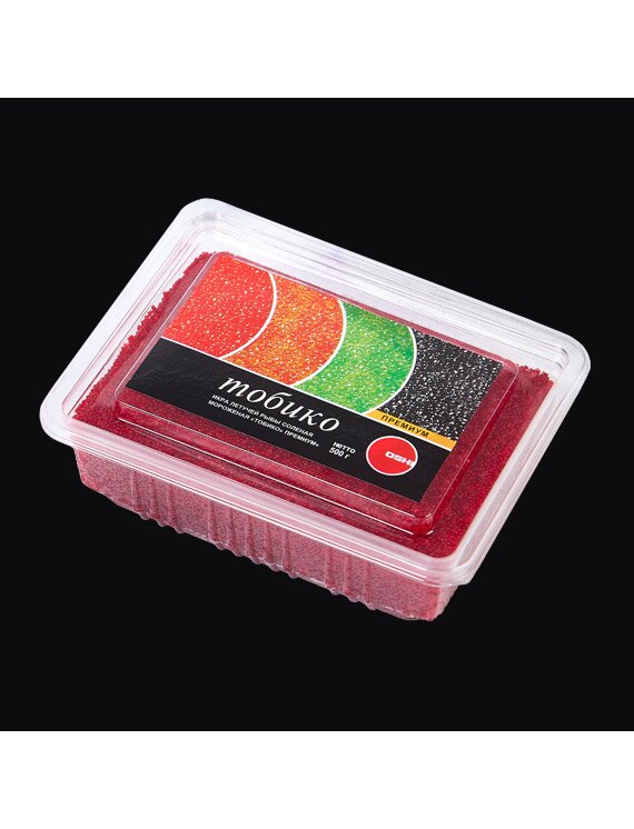 Состав: икра летучей рыбы, усилители вкуса и аромата: Е621; регуляторы кислотности: Е330; консервант бензоат натрия (или консервант Е211), соль поваренная пищевая, краситель пищевой искусственный (Е122).