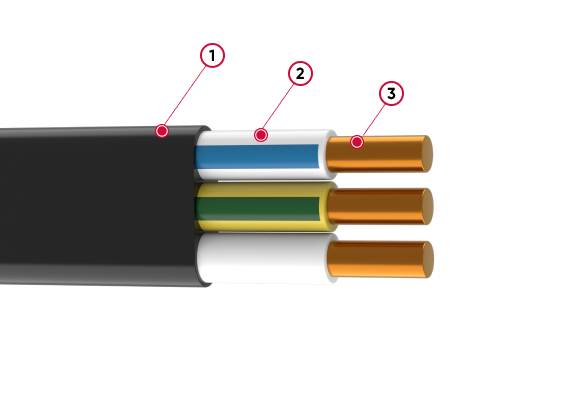 Кабель силовой плоский ВВГ-П с медными жилами, изоляцией и оболочкой из ПВХ. предназначен для передачи и распределения электроэнергии в стационарных электротехнических установках на номинальное переменное напряжение 0,66 и 1 кВ номинальной частотой 50Гц.Кабель предназначен для прокладки одиночных кабельных линий в кабельных сооружениях и помещениях. При групповой прокладке таких кабелей обязательно применение средств огнезащиты.
