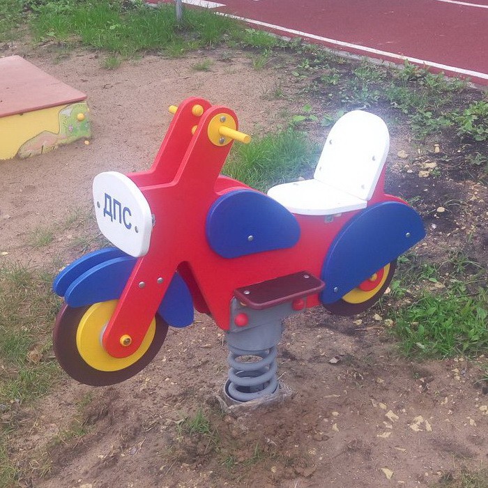 Качалка на пружине "Мотоцикл" устанавливается на уличных детских площадках. Предназначена для детей дошкольного возраста от 3-х лет. Имеет сиденье со спинкой, 2 боковины, 2 колёса, 2 передних крыла, 2 задних крыла, фару из влагостойкой фанеры толщиной 21 мм. Металлические поручни и подножки для ног. Сечение прутка пружины 22 мм с расстоянием между витков 40 мм для исключения защемлений пальцев ребёнка. Фанерные элементы окрашены 2-мя слоями краски на водной основе и покрыты лаком. Металлические элементы окрашены порошковой краской. Габаритные размеры - 1100*350*1000 мм.