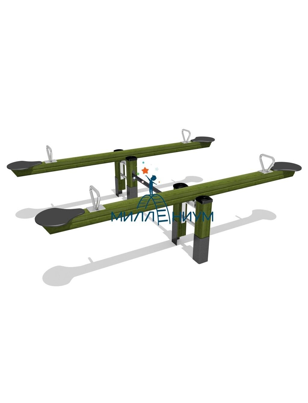 Качели-балансир двойной - это игровое оборудование для детских площадок, представляющее собой две параллельные балки (или доски) на общем основании, позволяющее одновременно качаться четверым детям (по двое на каждой балке), развивая координацию, равновесие, силу и навыки командной работы, обучая детей взаимодействию и преодолению страха высоты. Качели рассчитаны на возраст - от 3 до 12 лет. Длина - 2650 мм. Ширина -1850 мм. Высота - 800 мм.