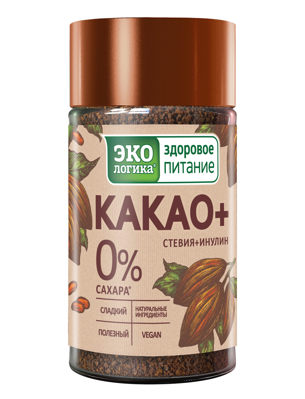 КАКАО+ сладкий без сахара, со стевией и пребиотиком.