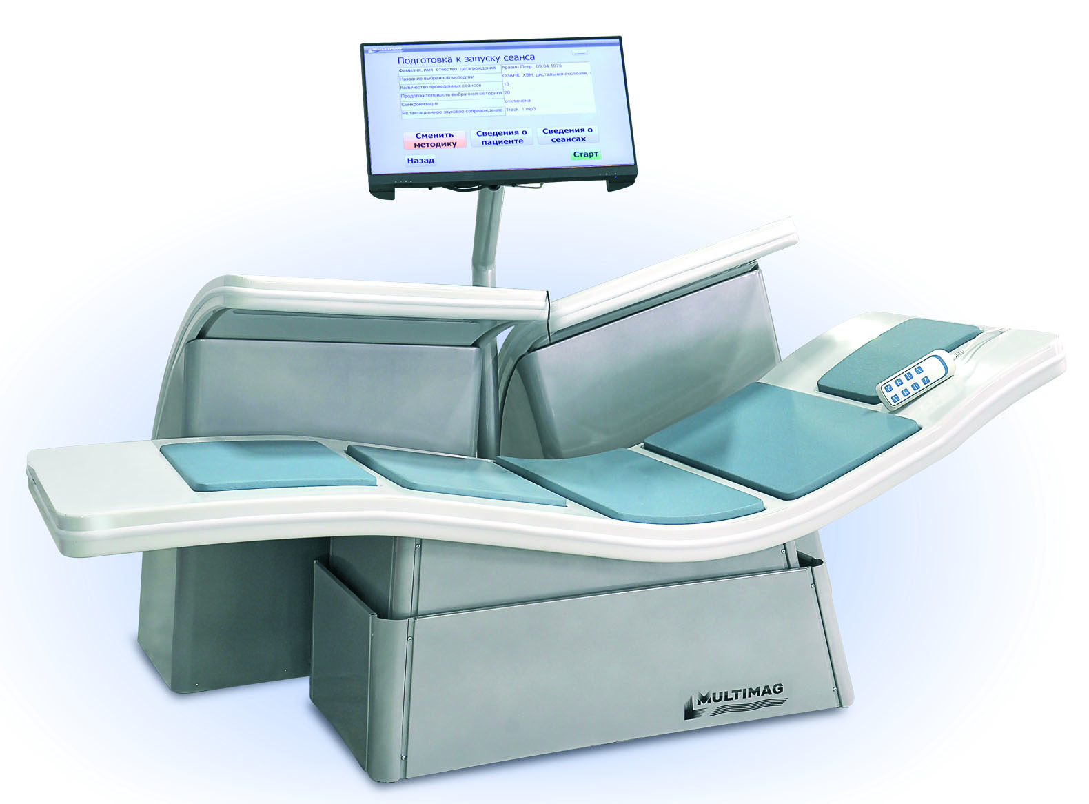КАП-МТ/8-"МУЛЬТИМАГ" предназначен для дозированного воздействия слабыми частотно-модулированными магнитными полями на организм человека в целом и на отдельные его части. Метод основан на лечебном и оздоровительном действии низко-интенсивного магнитного поля специальной структуры. Лечение эффективно, безболезненно и вызывает приятные субъективные ощущения. Достигаются положительные результаты в 85% случаев при лечении атеросклероза; облитерирующего эндартериита конечностей; болезней Бюргера и Рейно; диабетической ангиопатии; гипертонической болезни; ишемической болезни сердца; хронической венозной недостаточности. Выраженный оздоровительный эффект при хронических и вяло текущих процессах: деформирующем остеоартрозе; шейном, грудном и поясничном остеохондрозах; межреберной невралгии; миозите; медленно консолидирующихся переломах; ушибах; в период предоперационной подготовки и послеоперационной реабилитации. Внешние габариты - 2004*1226*950 мм. Масса - 170 кг.
