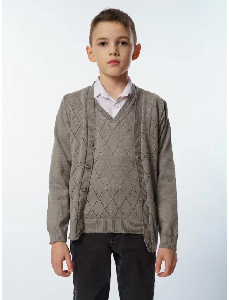 Кардиган с жилетом серый идеальный выбор для школьной формы.Изготовлен из 50% хлопка и 50% пана, обеспечивая мягкость и прочность.Произведен на плосковязальной машине SHIMA 14 класса (Япония), что гарантирует высокое качество изделия.Передняя часть украшена ромбовой перфорацией, а спинка выполнена из кулирки для дополнительного комфорта.Этот кардиган сочетает стиль, удобство и долговечность.