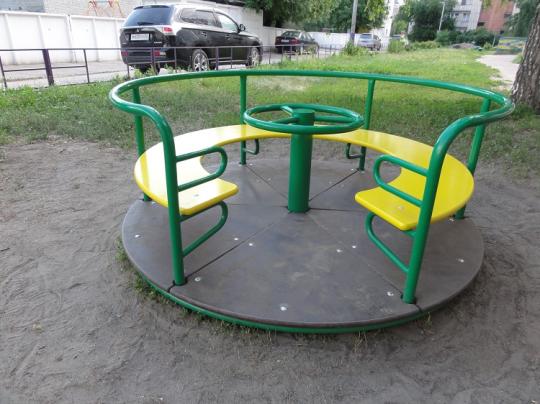 Карусель "Колесо" - это разновидность детского аттракциона, представляющая собой вращающуюся платформу, похожую на колесо, на которой дети могут сидеть или стоять, развивая равновесие и координацию, а также просто весело проводить время. Размер карусели - 1600*1600*1000мм. Для изготовления карусели используется влагостойкая фанера. Покрытие фанеры - грунтовка, краска на водной основе. Покрытие металлических деталей: - порошковая краска. Все крепежные изделия закрываются пластиковыми заглушками. Изделие бетонируется.