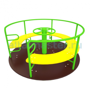 Карусель с рулем - это вращающаяся платформа с сиденьями и центральным рулем, установленная на детских площадках для активного отдыха, развития координации, вестибулярного аппарата и воображения, где дети сами приводят ее в движение, вращая руль или отталкиваясь, создавая "сказочные приключения". Карусель предназначена для детей от 3 до 12 лет. Представляет собой цельносварную конструкцию, состоящую из основания и вращающейся платформы с единым сиденьем. Металлические элементы окрашены полимерными порошковыми красками. Все фанерные детали выполнены из влагостойкой фанеры ФСФ, скругленной и отшлифованной по торцевым срезам для обеспечения безопасности и увеличения срока службы. Для окраски фанеры применяются специальные атмосферостойкие краски, предназначенные для использования на детских площадках. Габариты - 1660*1660*850 мм.