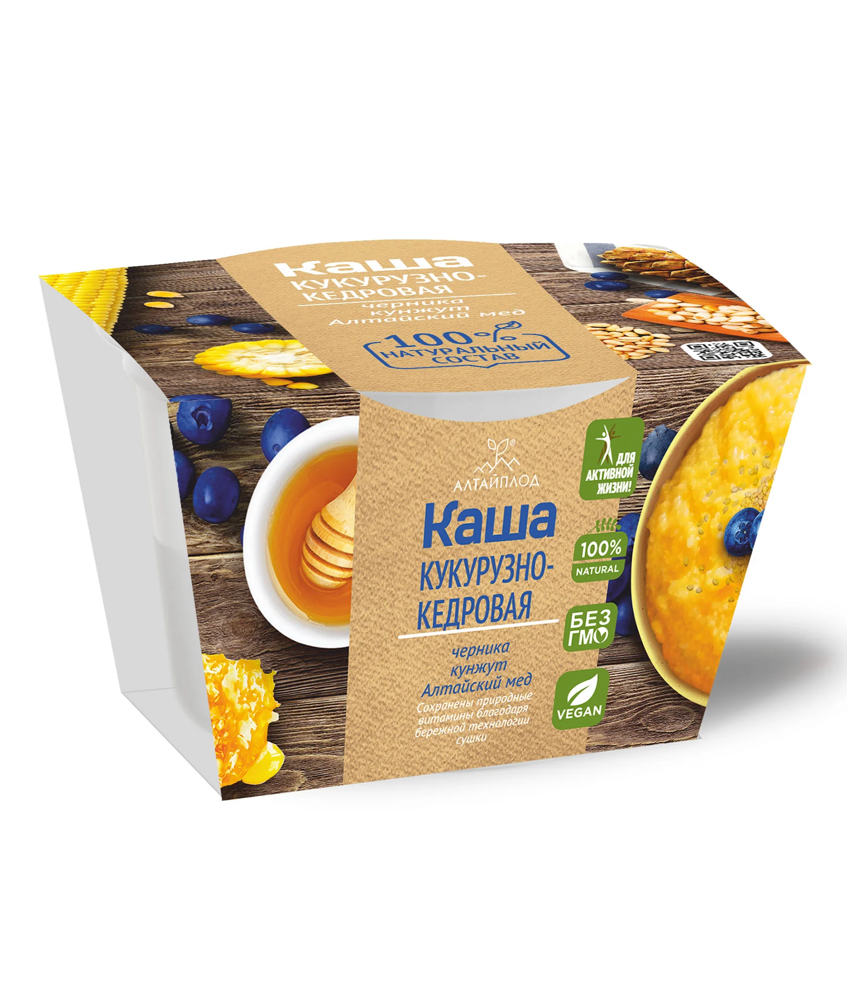 Каша кукурузно-кедровая с черникой, кунжутом и Алтайским медом -это натуральный продукт с высоким содержанием растительного белка, полезных природных витаминов и микроэлементов, а также пищевых волокон.