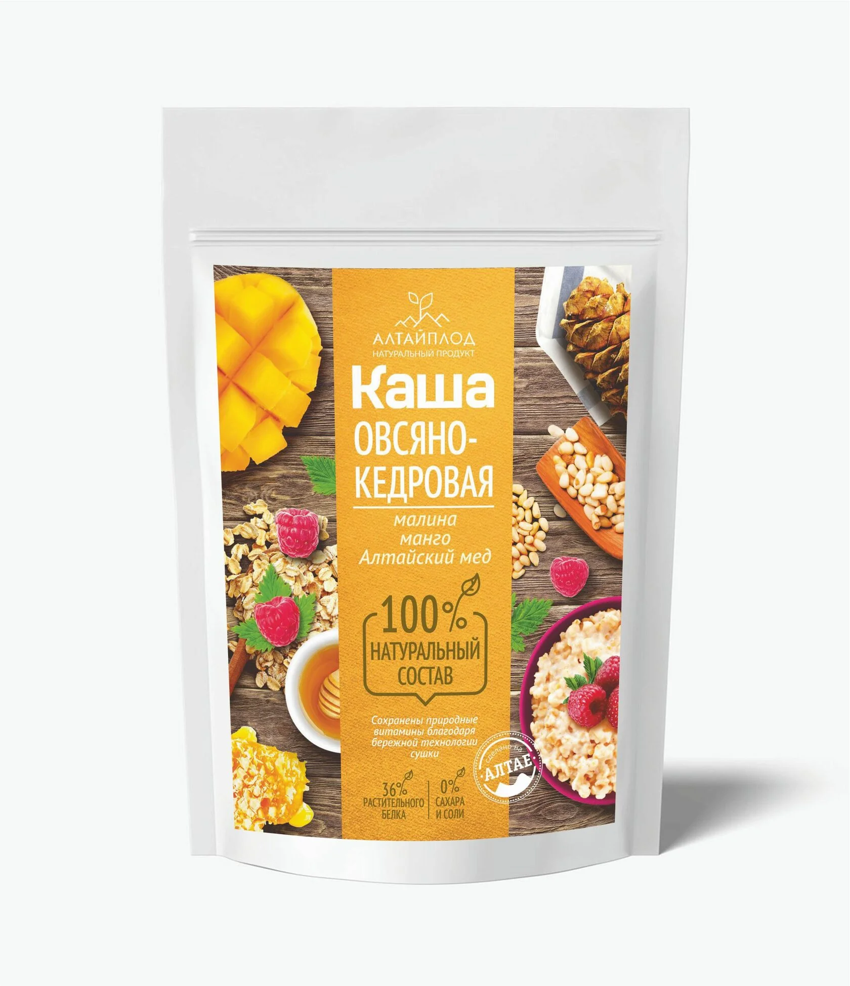 Каша овсяно-кедровая с манго, малиной и Алтайским медом - это натуральный продукт с высоким содержанием растительного белка, полезных природных витаминов и микроэлементов, а также пищевых волокон.