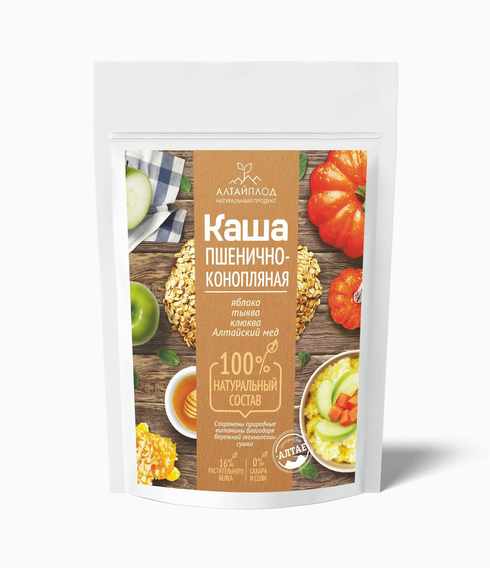 Каша пшенично-конопляная с тыквой, яблоком, клюквой и Алтайским медом - это натуральный продукт с высоким содержанием растительного белка, полезных природных витаминов и микроэлементов, а также пищевых волокон.