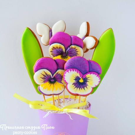 В букете 3 цветка анютиных глазок , 2 листа, и 2 бабочки. Упаковка в мини кашпо с золотым тиснением. Каждый пряник упакован в пакетик (на фотографии пряники без пакетов, так как при съемке пакеты бликуют). Само кашпо упаковывается в пленку с бантом. Цвет пряников - на выбор.