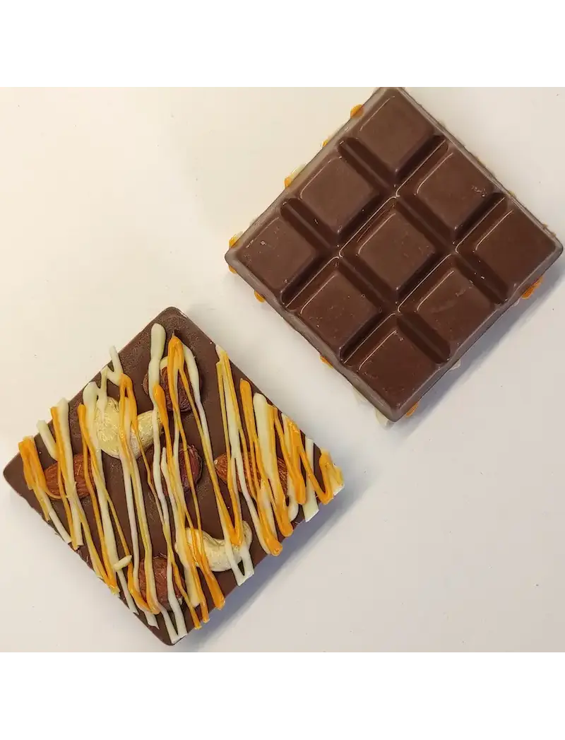 Молочный с полосками Белого и Апельсинового шоколада с Фундуком, Кешью и Миндалём.