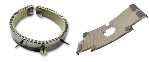 Керамические хомутовые нагреватели (их еще называют манжетными или кольцевыми нагревателями) – это резистивные электронагреватели основной особенностью которых является то, что резистивная проволока размещена внутри керамических косточек. За счет данной конструктивной особенности, максимальная температура нагревателя может достигать 500°С. Керамические хомутовые нагреватели используются зачастую для нагрева сопла экструдера или других цилиндрических поверхностей. Керамический хомутовый нагреватель представляет собой резистивную проволоку в виде спирали, расположенную внутри керамических изоляторов, собранных в нагреватель необходимой формы и помещенных в корпус из нержавеющей стали. При необходимости изготавливаются керамические полукольцевые нагреватели. В керамическом кольцевом нагревателе могут быть изготовлены отверстия (только при его производстве) согласно требованиям заказчика. Также нагреватель может быть оснащен встроенной термопарой. Керамический хомутовый нагреватель может быть изготовлен с одним из типов подключения.